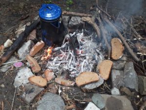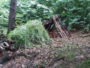 Bei diesem Training konnten die Teilnehmer große Erfolge erzielen. So schafften es beide, ihre erste Glut zu drillen und daraus ein Feuer zu entfachen. Es bedarf schon etwas Training um so einen Erfolg zu haben. Die erste Nacht schliefen wir in einer „Sushirolle“, obwohl das Laub und auch das Gras nass waren, hatten wir es alle warm. Tja, wenn man weiß wie, kann man sich auch bei Regen warm durch die Nacht bringen. Am zweiten Tag ging es ans Biwak bauen. Wir brauchten schon einige Stunden dafür und es war doch anstrengend, jedoch hatten wir dann nachts den Komfort. Auch an diesem Tag regnete es immer wieder und so wurden unsere Teilnehmer nass bis auf die Haut. Es schien sie nicht zu stören. Abends am Feuer, wenn man wieder etwas Trockenes angezogen hat und am Lagerfeuer gekochte Gemüsesuppe isst, fühlt man sich dafür umso glücklicher. Viele Routinen konnten wir wieder durchführen, eine Schüssel brennen, das 5 min Feuer verbessern und unsere